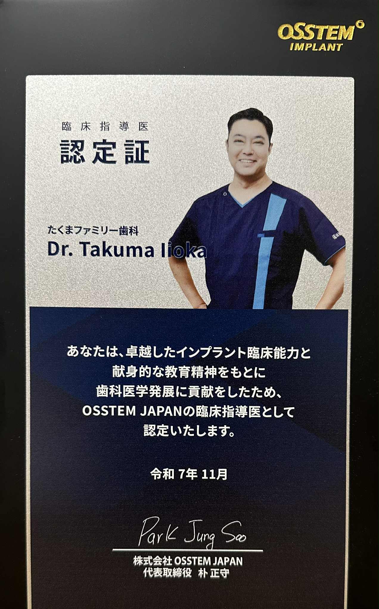 - 世界3大インプラントメーカー(オステムインプラントメーカー)より、「臨床指導医認定証」授与